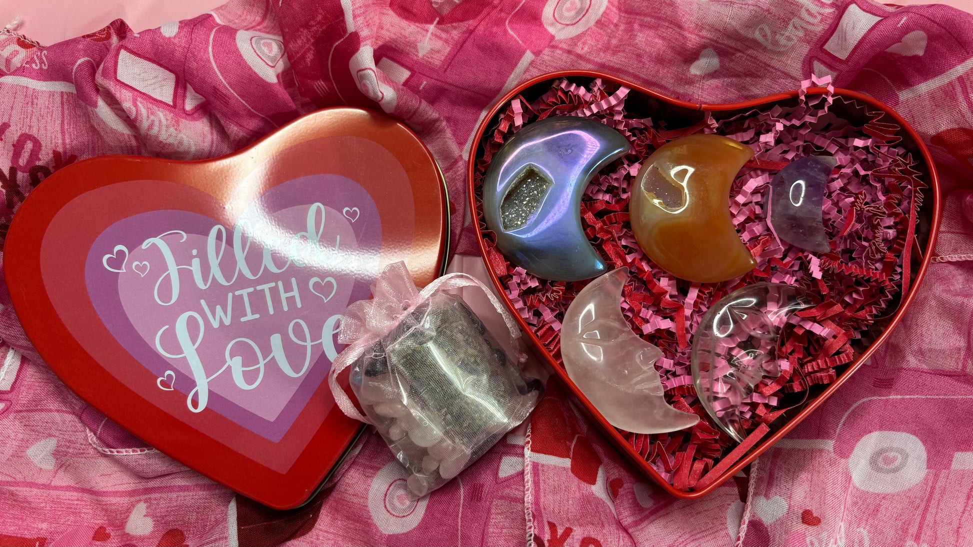 Each bundle pack included the crystals and/or spiritual tools pictured along with a mini bag of our “Valentines Day Mini Crystal Confetti” which consists of rose quartz and amethyst crystal chips, rose petals, lavender and mini crystal trinkets.