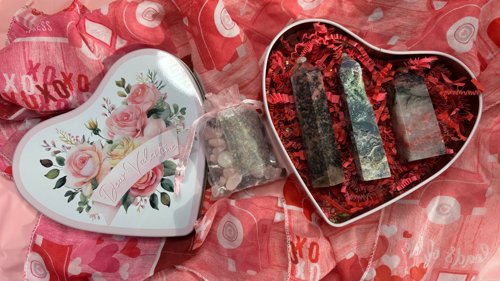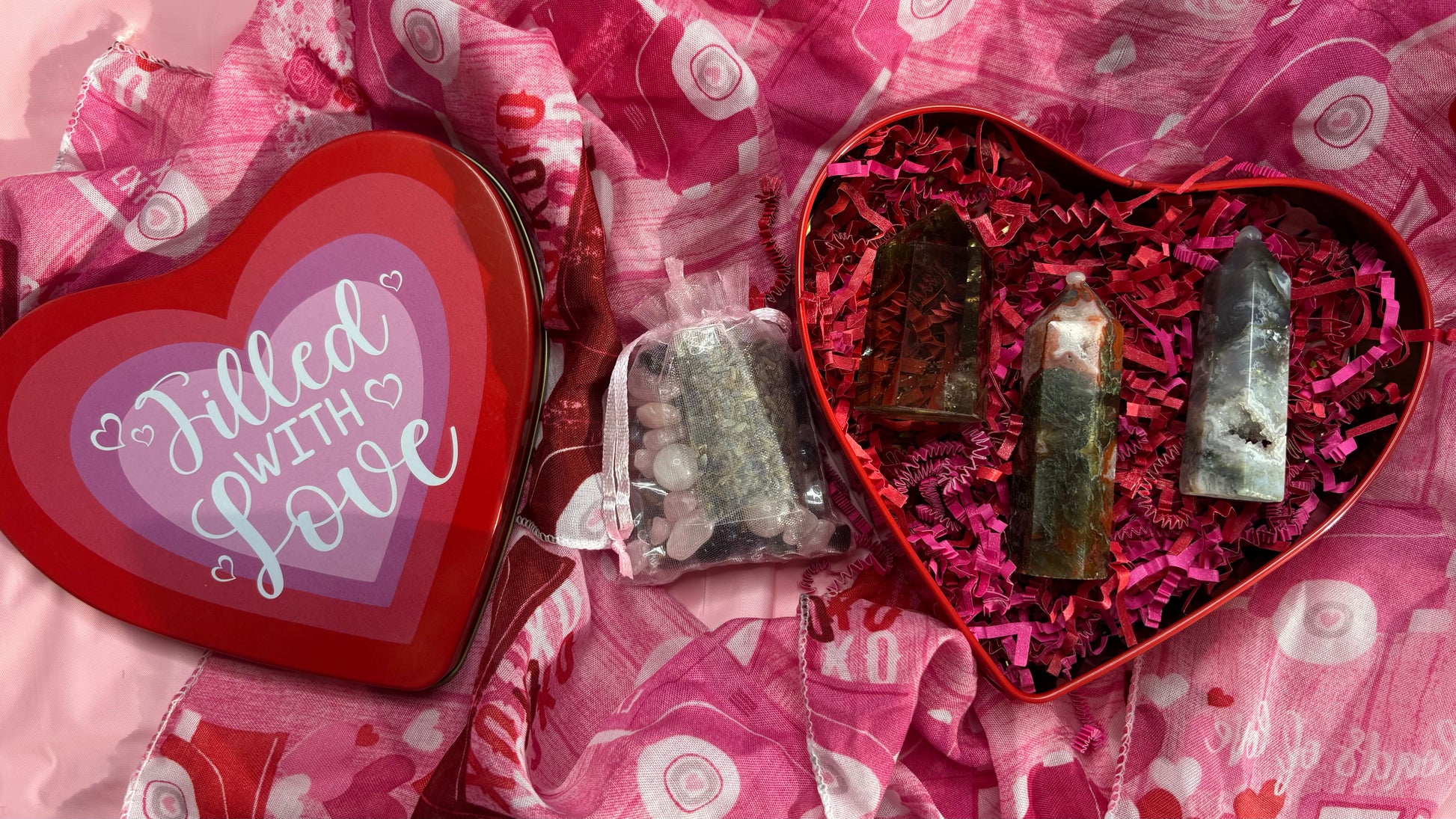 Each bundle pack included the crystals and/or spiritual tools pictured along with a mini bag of our “Valentines Day Mini Crystal Confetti” which consists of rose quartz and amethyst crystal chips, rose petals, lavender and mini crystal trinkets.